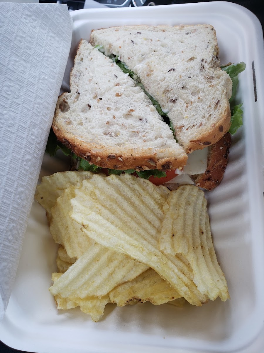 Amazing super tasty sandwiches with terrific whole grain breads and fresh chicken! Salads, soups and fresh bake! Excellent service and average to low prices. 6-8$ price range for a sandwich. Feel Good Cafe brand coffee beans from their own roaster served and available by the bag! I will be back! I do feel good after having some of their fare... :) Coffee is not fair trade but is organic. They offer you a Psalm on your coffee cup for your day! Mine seemed to bring me cheer! FYI they give you a bag for your takeout without you having to ask!Would like to see more vegetarian sandwiches ( like with soy products) on the menu.